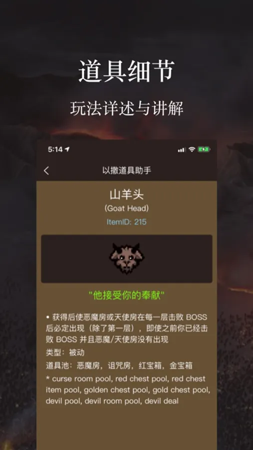 3.道具详情这款APP是工作之余弄的初版,完全处于对以撒这款游戏的热爱而做。