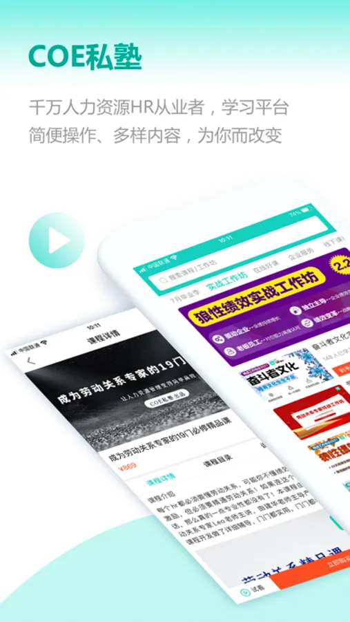 “COE私塾”是一款针对于HR、职场人士在线学习和社交平台。立足于适应性的要求,与多家教育培训机构和行业的专家、讲师建立合作,聚合了丰富的学习内容,包括课程视频、资料等。平台提供系统化的学习,旨在帮助用户获得全面的、非零散的知识和技能,实现学有所长,并能学以致用。