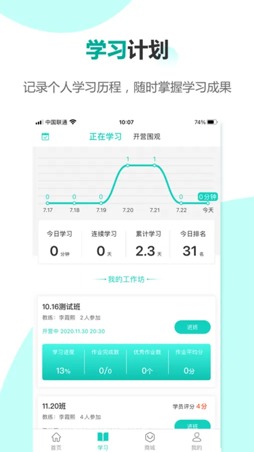 4.【我的学习】展示了用户最近一周的学习时间及学习记录,用户可将自己的学习记录分享给微信好友或朋友圈,邀请好友一起来学习。