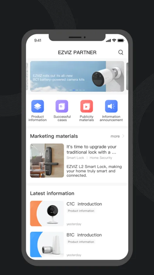 This product serves members and partners of Ezviz Inc. It aims to build online and offline integration of fluorite products and services, and provide more convenient services for partners. The information module provides timely information so that partners can keep abreast of Fluorite's policies and the messaging module pushes timely news. The work module provides work reports and other content for internal members.