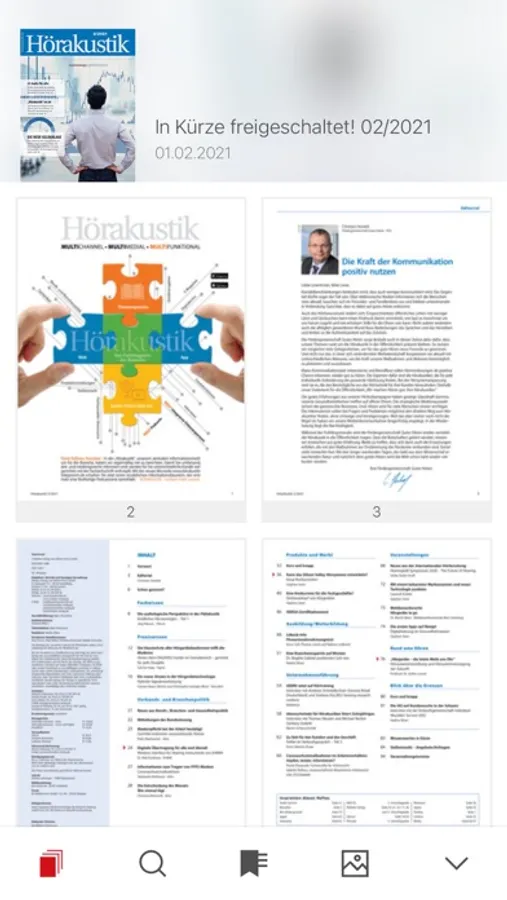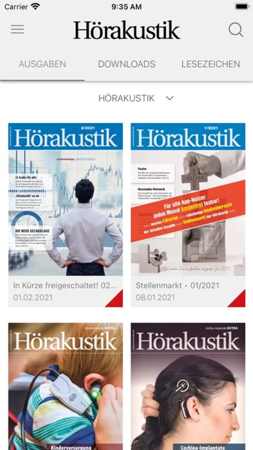 Regelmäßig stehen allen App-Benutzern ausgesuchte Publikationen, wie die Sonderausgabe zum jährlichen EUHA-Kongress „Hörakustik | Die Fachausstellung‘‘ und weitere attraktive digitale Inhalte sowie der jeweils aktuelle Hörakustik-Stellenmarkt aus der Fachzeitschrift frei zugänglich Lesen zur Verfügung.