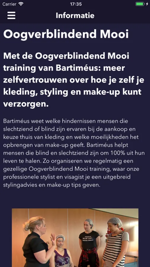 Oogverblindend Mooi is een training van Bartiméus, speciaal voor slechtzienden en blinden, waar professionele stylisten en visagisten en ergotherapeuten je een uitgebreid stylingadvies en make-up tips geven.