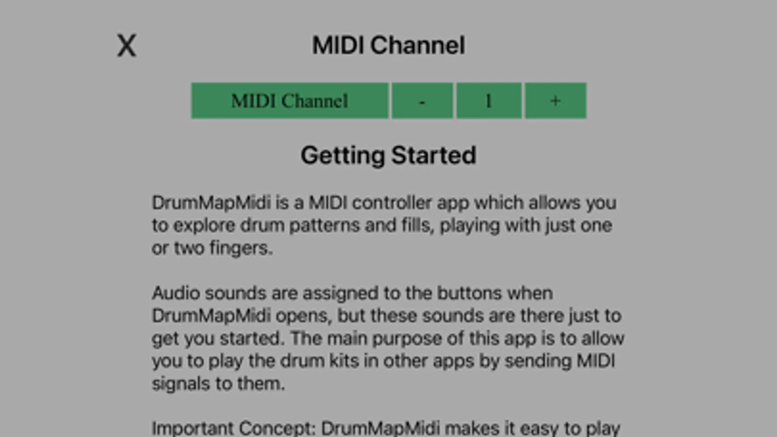 DrumMapMidi is designed to make it easy to tap out basic drum patterns and send the MIDI information to other General MIDI drum kits in other apps.