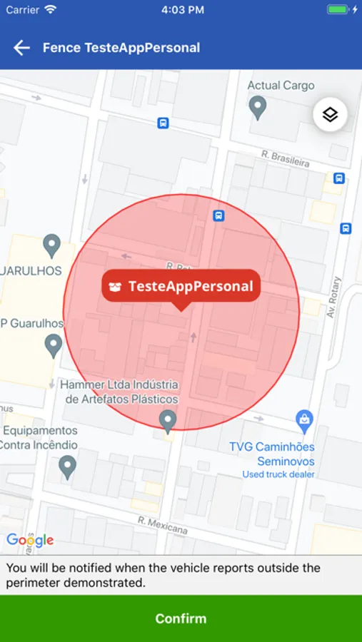 Você poderá gerenciar o evento de alerta de cerca que emitirá um alerta caso seu veículo saia do raio da cerca.