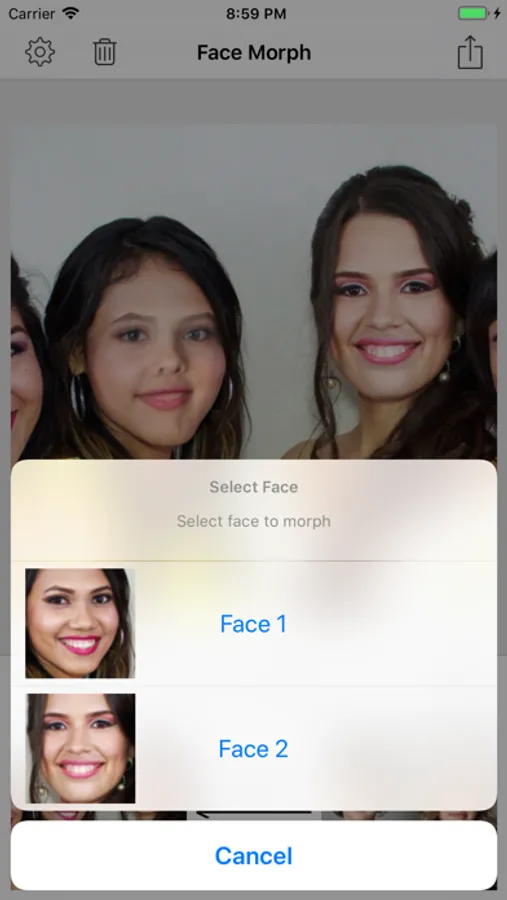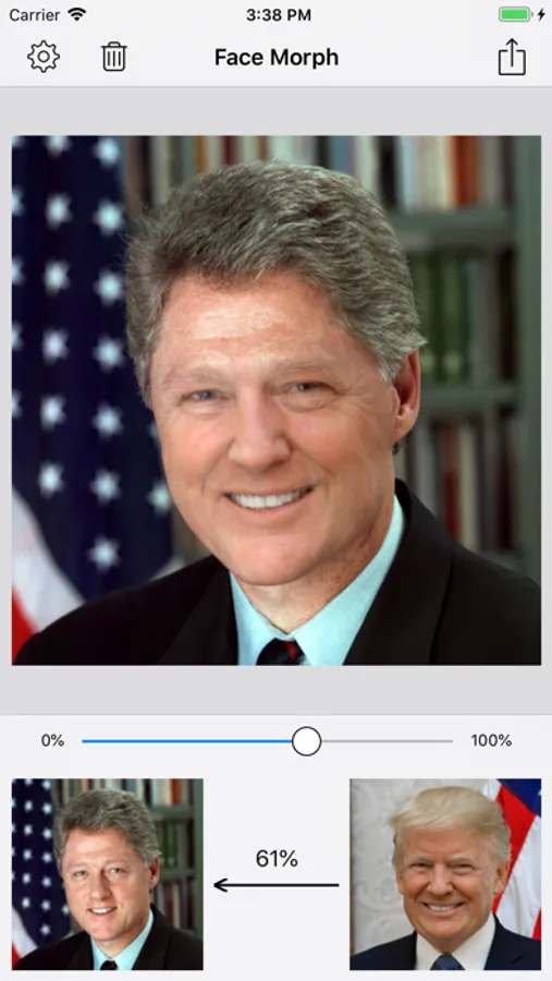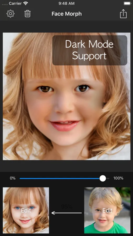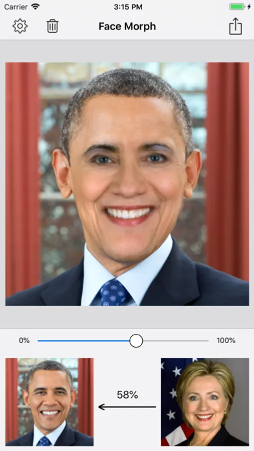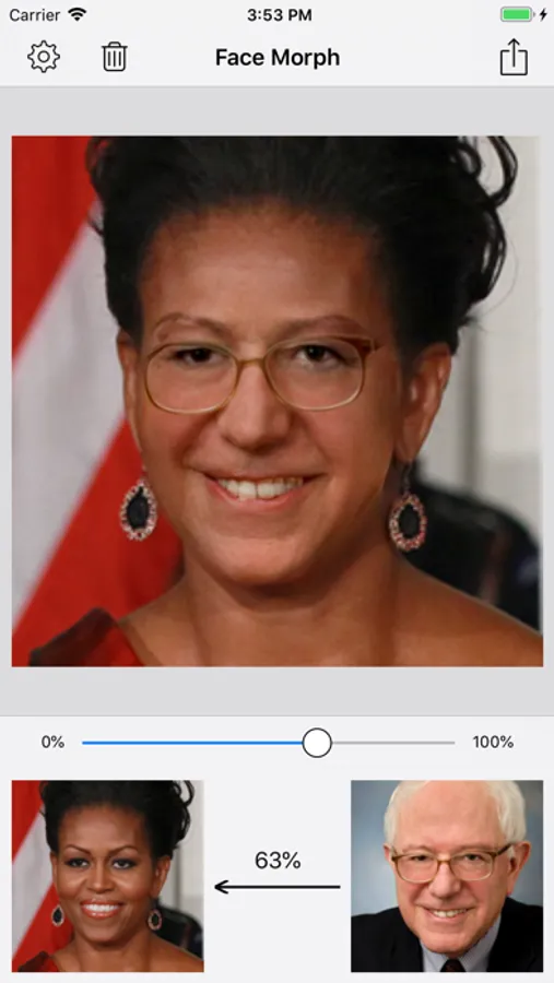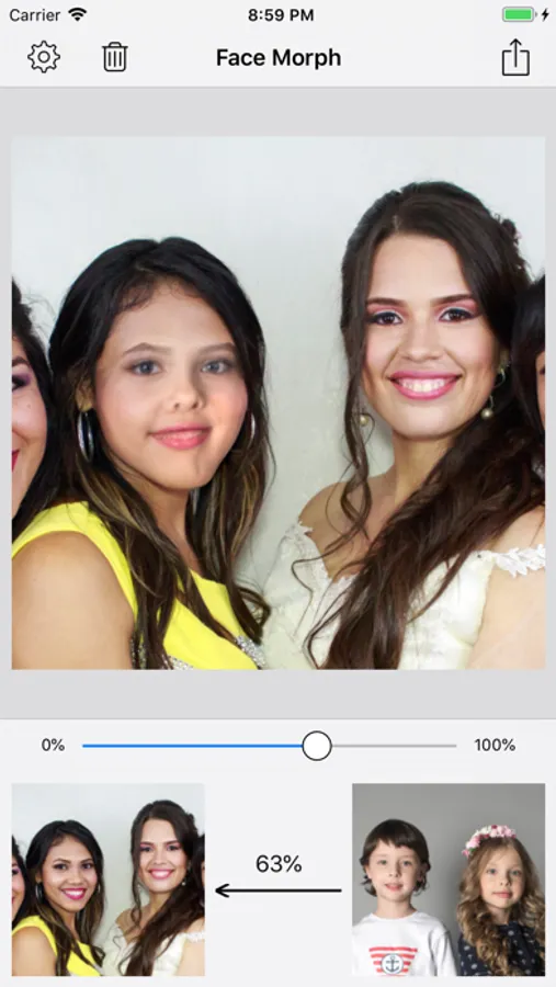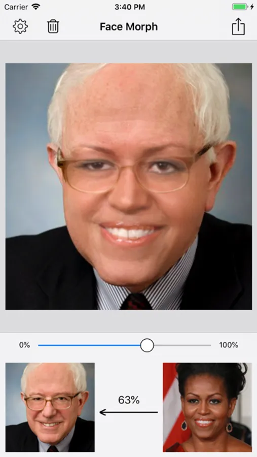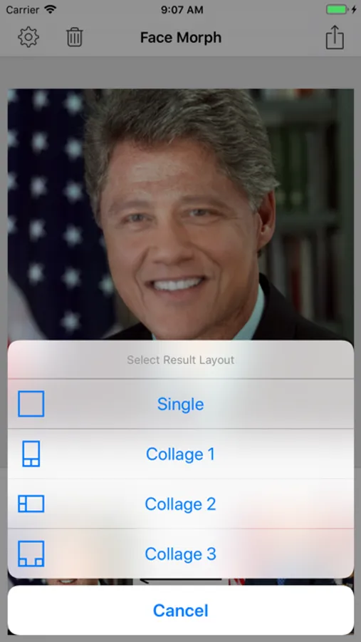 - Save morphed face photo as single image or collage.