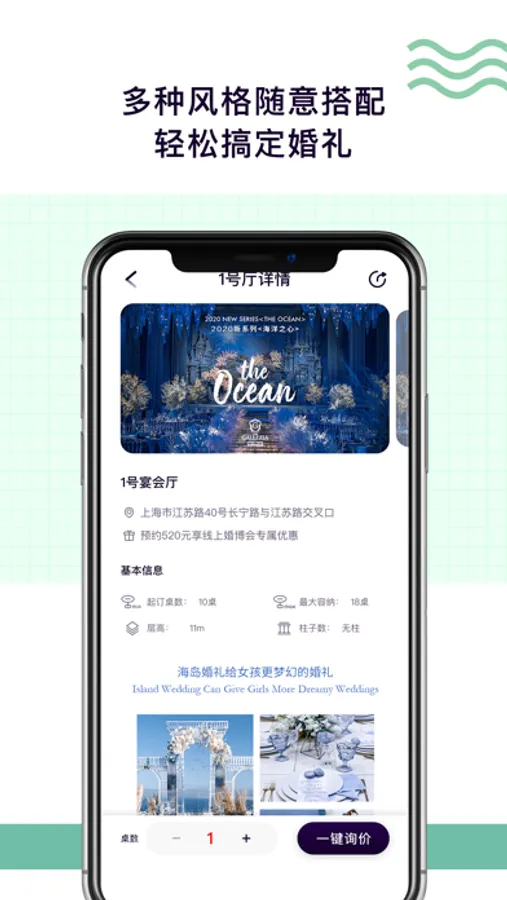“距离你3公里的海岛”——格乐利雅(中国)婚礼堂海岛婚礼坐落于距离徐家汇中心1公里的龙华地区,周边交通便利。作为全亚洲最小资的婚礼堂,格乐利雅整体采用Town House建筑设计风格,以海岛主题为特色,让每一位宾客体验到一场私密花园式Party。内部12座挑高11米的无柱豪华宴会厅,配以3D全息投影、演唱会级别的舞美、灯光、音响设计,加上浪漫关岛仪式堂,独立的草坪和休息空间,力求为新人们提供一场难忘的结婚盛典。