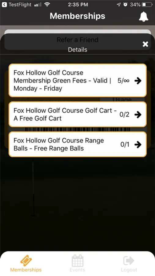 Has a quick link for booking Tee Times. Ability to view usages and see how many you have left.