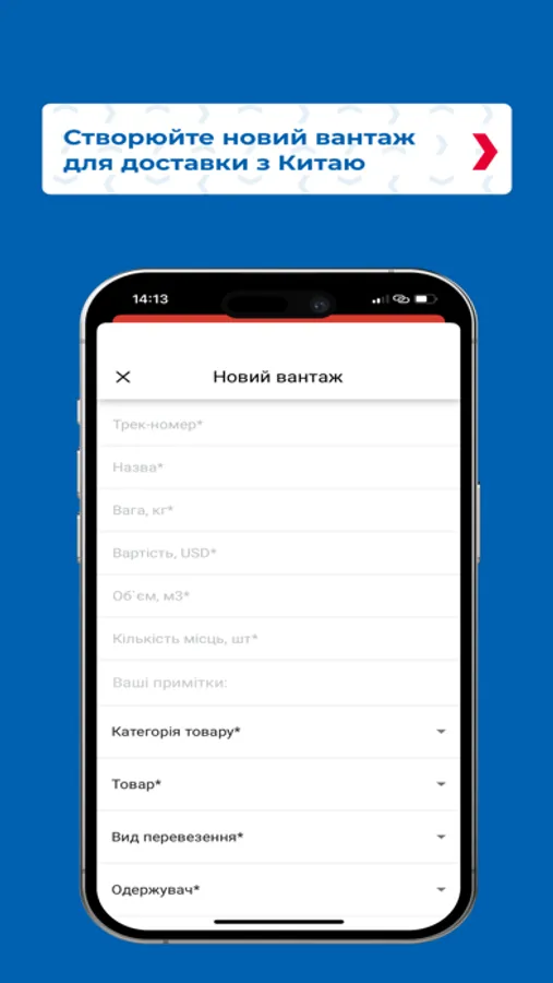 Meest China Cargo is a commercial delivery service that performs cargo shipment from China to Ukraine. It's both for business and your personal purchases. If your item weighs more than 30 kilograms and/or costs more than 150 EUR - this application is for you! In this application you can: