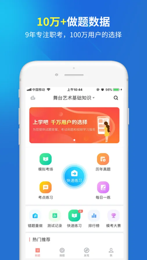 演出经纪人考试题库有模拟考场、历年真题练习、每日一练、快速练习、考点练习、考试押题、做题记录等多种学习与做题模式、丰富多样化的陪你一起考演出经纪人。