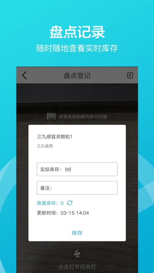 快速完成核对库存,解决繁琐的盘点。在这里你只需要用手机扫描药品上的条形码,即可快速完成盘点。散盘可扫描药品查看实时库存;全盘可扫描药品创建盘点表。
