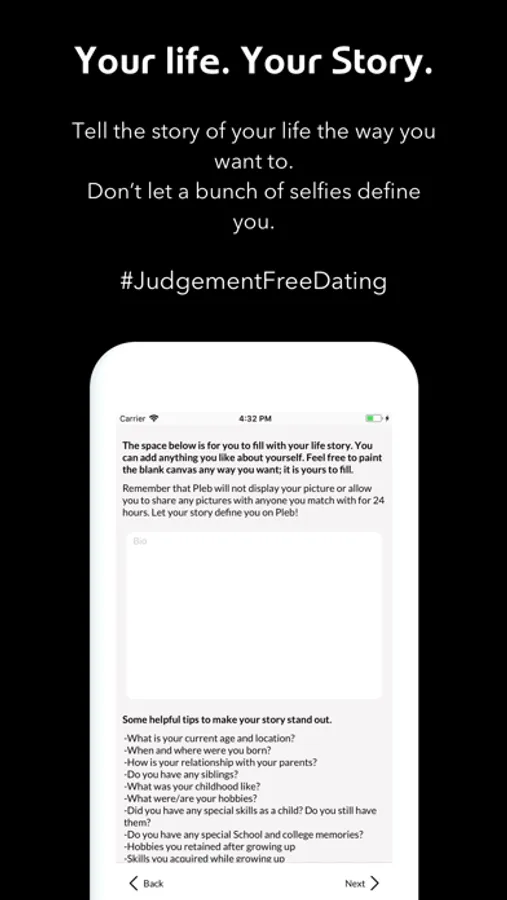 Pleb is an app that is all about you. It highlights the fine details of your personality that you so proudly stand by. Pleb is where you can tell the story of your life the way you want to.