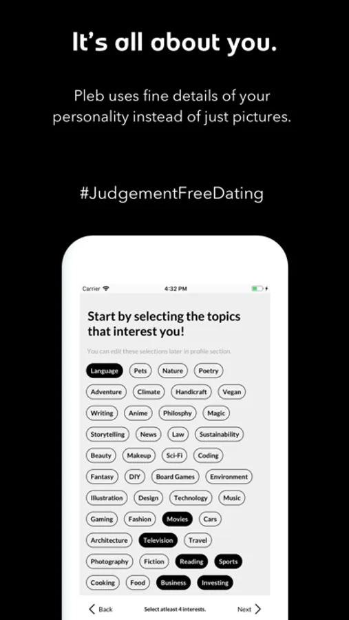 Using intricately designed questions that are designed to bring to the forefront the best qualities that you have, Pleb matches you with individuals that match your personality. The questions include your basic biography, along with what interests you. In essence, Pleb is all about what matters to you. You, are Pleb.