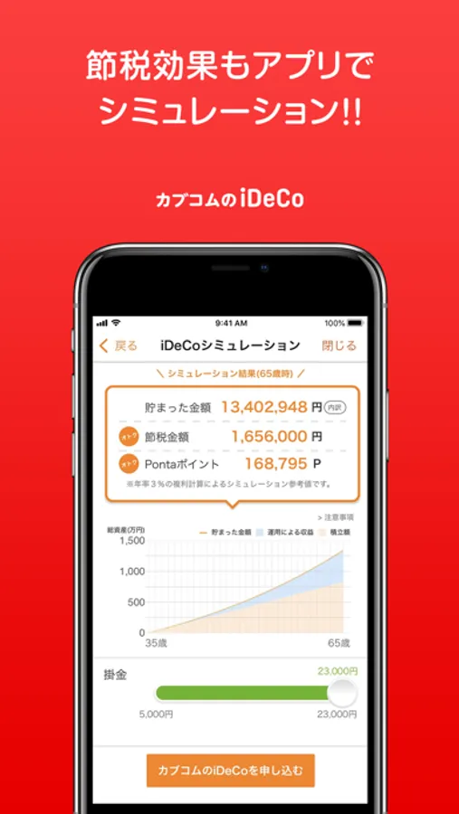 「カブコムのiDeCo(イデコ)」は、今、節税しながら、将来のために賢くお金を備える年金づくりをサポートします。「カブコムのiDeCo(イデコ)アプリ」ではスマートフォンアプリひとつで申込から加入後の運用状況の確認、運用スタイルの見直しまで簡単に行えます。また、事前に運用時のシミュレーションもできるので安心して始められます。手軽に便利な「カブコムのiDeCo(イデコ)アプリ」で将来の生活を豊かにするための「スマホ年金」を始めましょう!