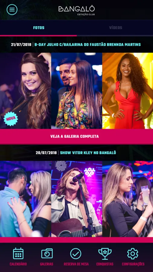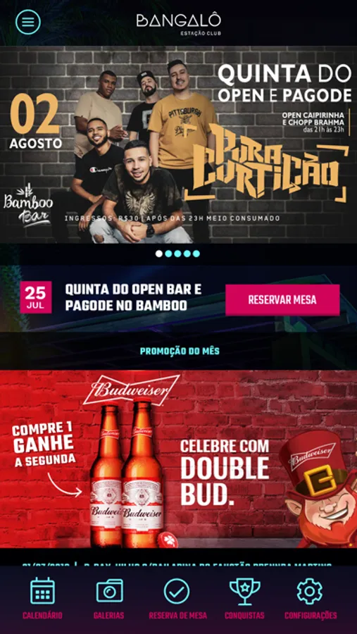 Aplicativo com promoções, agenda e fotos do Bangalô Estação Club.