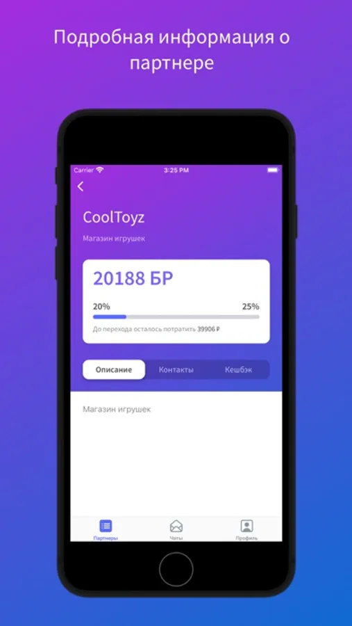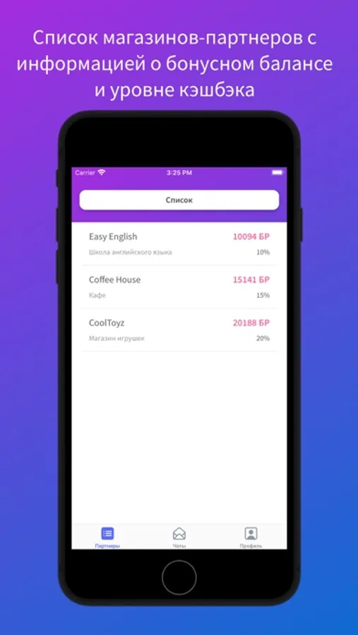 * Список магазинов-партнеров с информацией о текущих бонусных рублей и уровня кэшбэка;