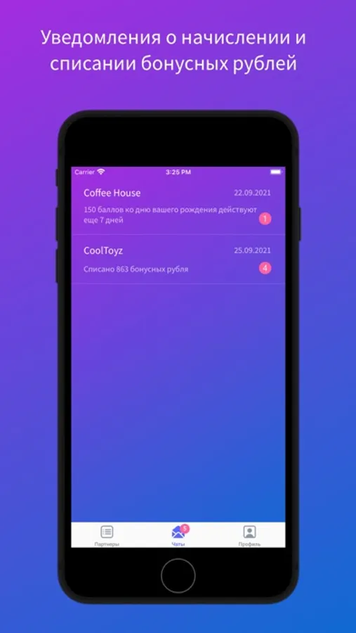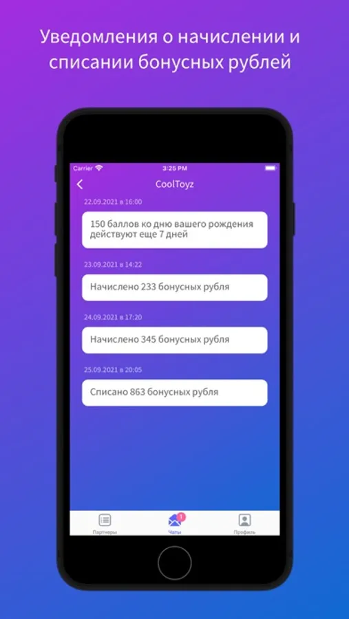 * Список уведомлений от партнера (начисление/списание бонусов);