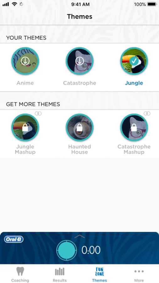 The first Oral-B Fun Zone theme available is the Jungle. The Anime, Cats and the Haunted House themes can be unlocked by acquiring points for improved oral care habits, such as brushing for the dentist recommended time of two minutes or a pressure free brushing session.