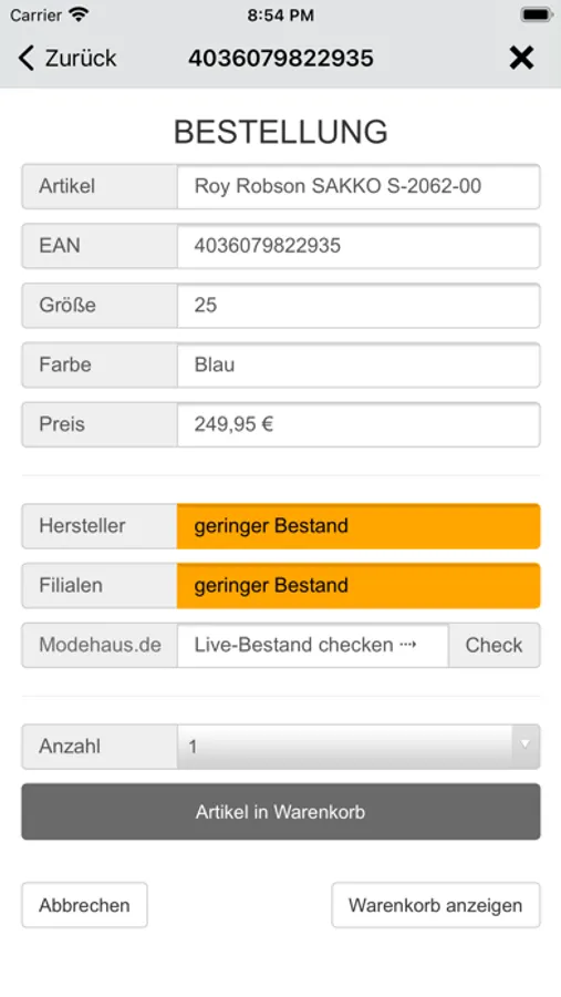 Die Warenbörse von Händlern für Händler in unserem Modehaus.de-Partnernetzwerk gleicht einen großen Nachteil des stationären Einzelhandels gegenüber Onlinehändlern aus. Mit dieser App kann der Verkäufer einen Artikel scannen, hat sofort auf die Bestände aller anderen angeschlossenen Fachgeschäfte Zugriff und kann dem Kunden ein im Haus nicht vorrätiges Produkt in der richtige Größe und Farbe in einem anderen angeschlossenen Modehaus bestellen und ihm entweder direkt nach Hause oder ins Geschäft liefern lassen.