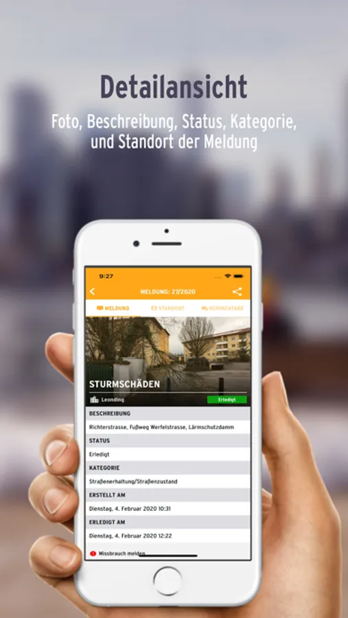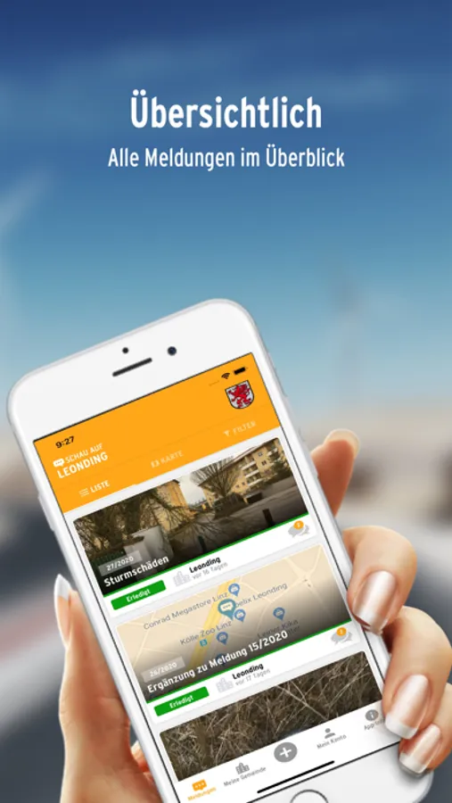 Mit der „Schau auf Leonding“-App können Sie der Gemeinde ganz unkompliziert Ihre Zufriedenheit, Ihre Verbesserungsvorschläge und Ideen, aber auch Mängel im öffentlichen Raum der Gemeinde melden. Alles, was Ihnen in Leonding positiv oder negativ auffällt, wird hier unbürokratisch an die zuständigen Mitarbeiterinnen und Mitarbeiter der Gemeinde Leonding zur Bearbeitung übermittelt. Die Mitarbeiter werden sich bemühen, die Mängel rasch zu beheben. In der Übersicht sind sämtliche Mitteilungen für alle Nutzer offen und transparent dargestellt. Der Status der Meldungen wird laufend aktualisiert.
