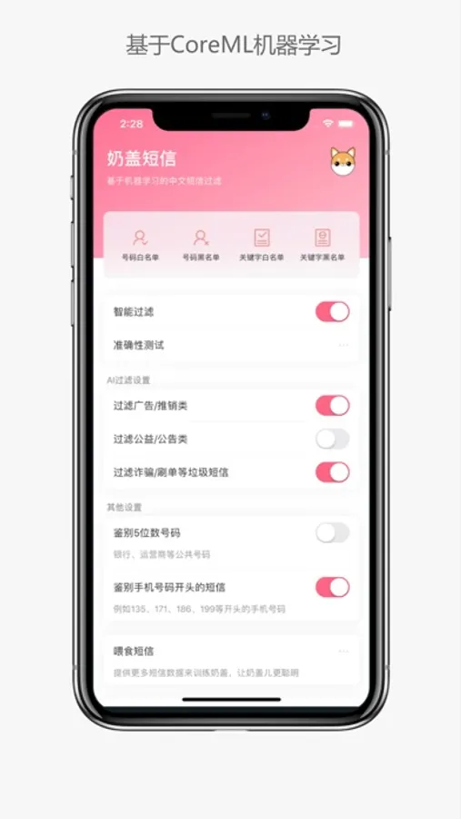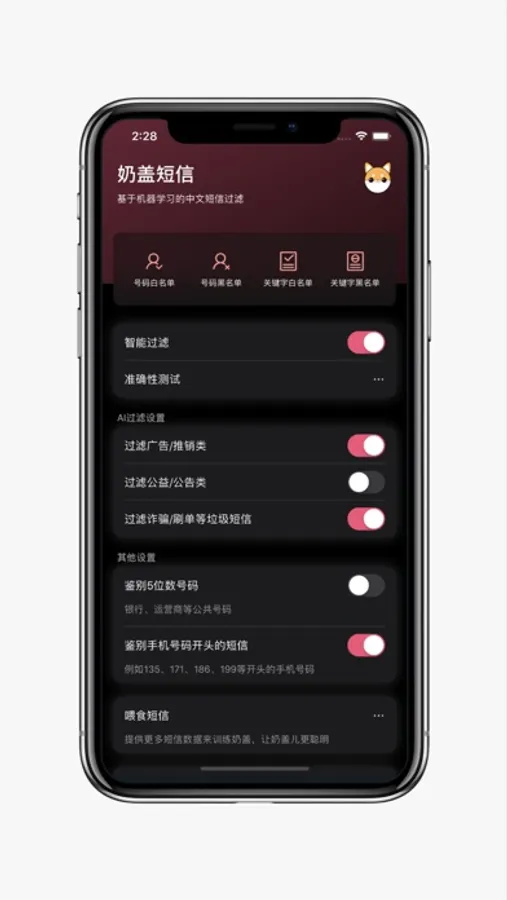 请参照App中的“功能说明”,同时您可以直接报告错误拦截的短信,您的数据都会经过脱敏后喂食给奶盖。喂食越多,他将越聪明,期待中~