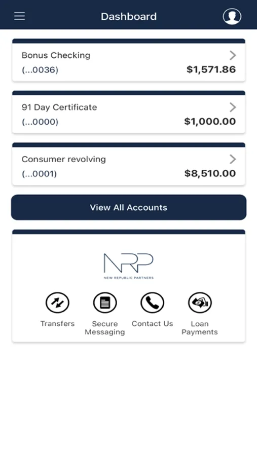 The NRP Mobile Banking mobile application enables authorized clients of New Republic Bank to access account data with a simple, useful interface. Performance reports are provided for specific time frames and account types.