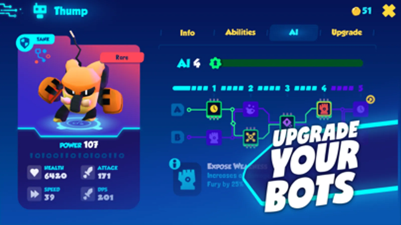 Outsmart your foes in a unique strategic battle system. Your bots will leap, charge, stun or blast around the arena using advanced AI while you pick the perfect abilities to stomp your foes. Each bot has unique abilities and a powerful ultimate, combine these with your favourite player abilities for maximum effect.