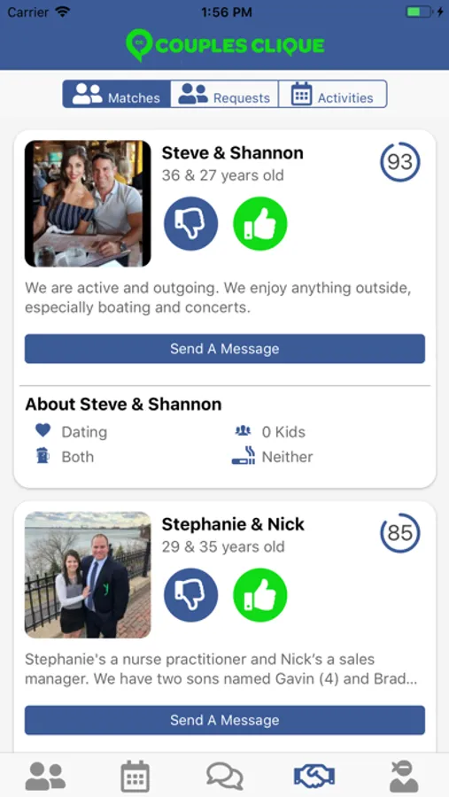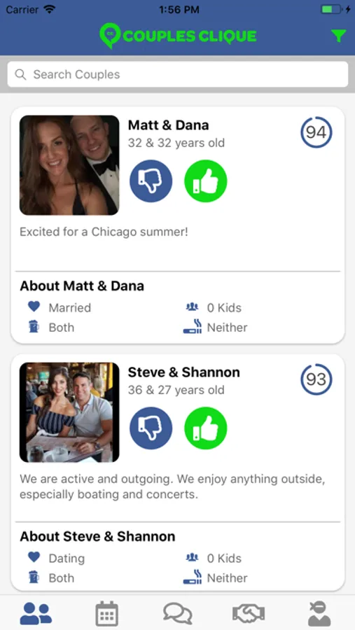 Couples Clique introduces you to similar couples in your area to create future friendships. Our free mobile app matches you to local couples and recommends things to do based on mutual interests. Use our app to message similar couples in your area so you can find fun local events to attend together. Adulting doesn't mean the end of your social life!