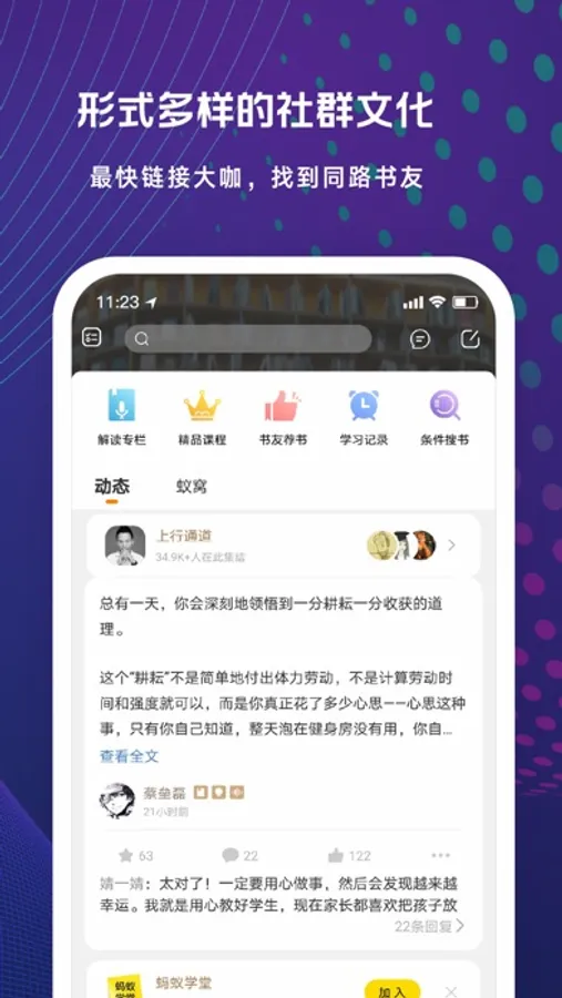 这里有关于学习的一系列配套工具,每个人都可以在蚂蚁私塾开设自己的社群——蚁窝,你可以在这里将自己的知识和技能变现,可以跟有相同兴趣爱好的书友交流,也可以跟其他领域的专业人士交换见解、请教问题,是最快速地获得顶级知识和交流乐趣的场所。