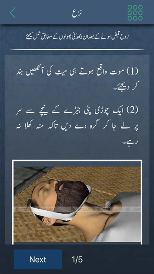 2). User will find all the content related to Funeral Bath, Burial and Prayer (Janaze ka Ghussal, Tadfeen, aur Namaz) in Unicode text, Images, Animations and Videos.