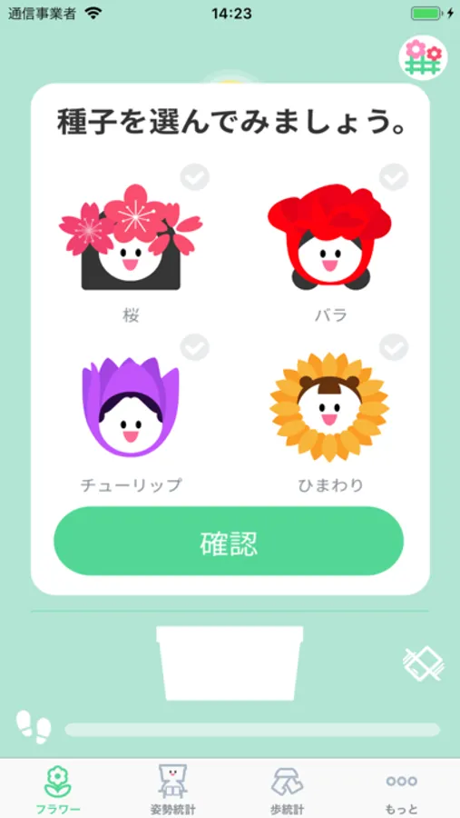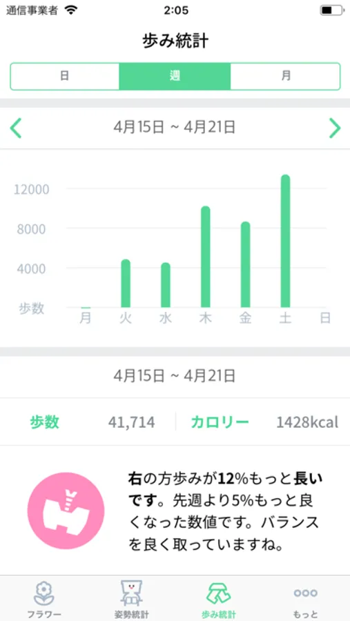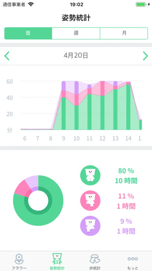 時間別、日付別に、自分の姿勢がどうだったかを一目で把握できる統計を提供するので、左右のバランスを簡単に確認できます。花を、豊かにたくさん集めてください。自分の姿勢がどれだけよくなっているのか花壇からも直観的に把握できます。