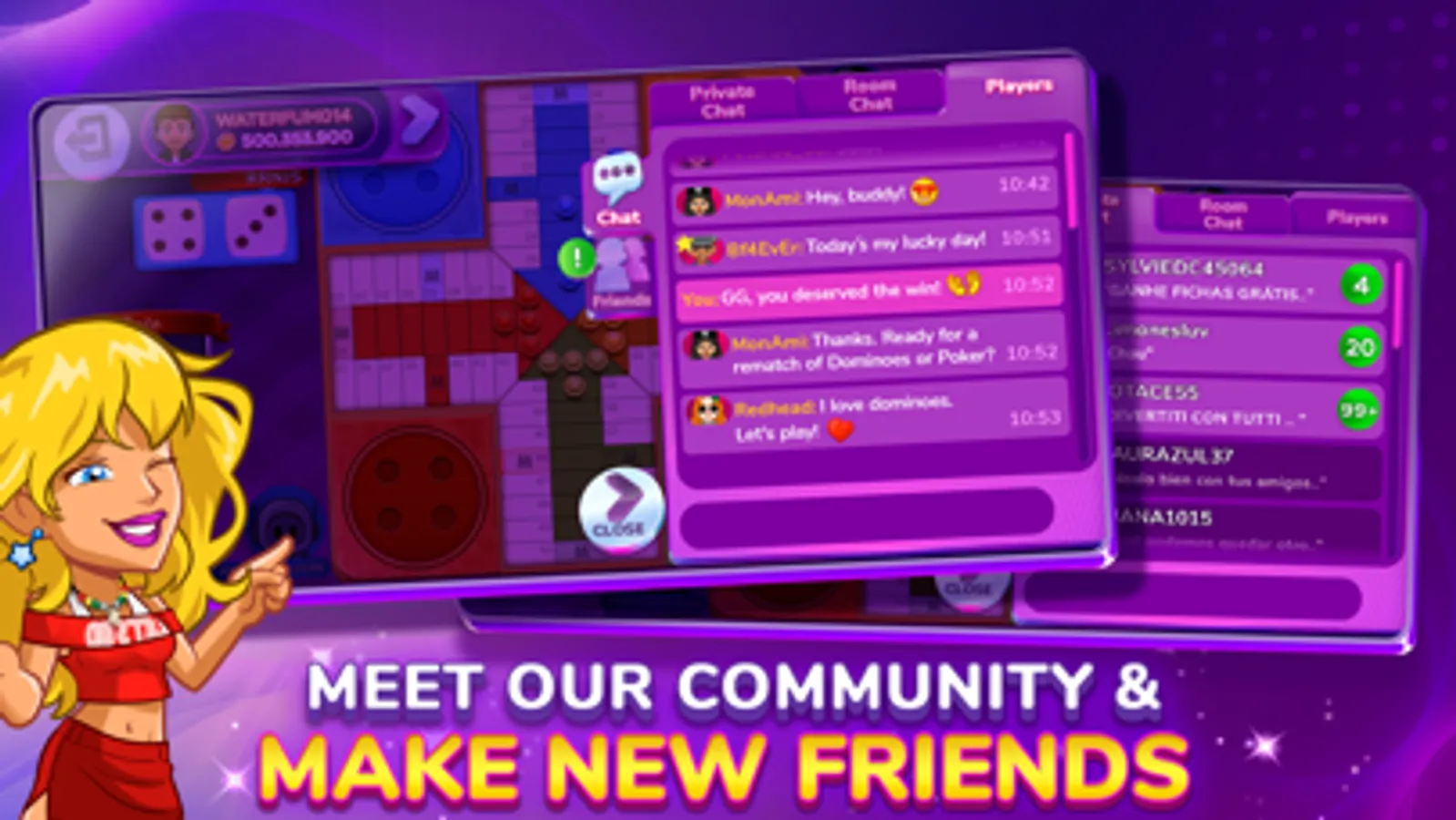Play online with your friends or meet new people from all over the world in the many different game rooms that you'll find. Join daily tournaments and compete for huge chip prizes! Team up with your friends to see who's the best, and even chat with them in real time!