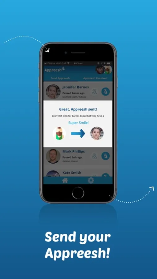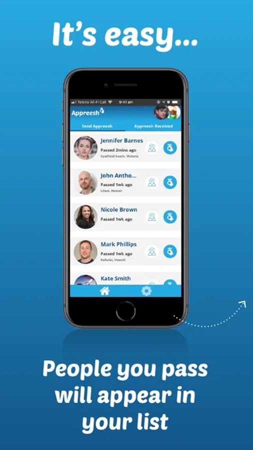 Appreesh will automatically create a list with people that pass near you. Once you see the list, you will be able to choose who you want to send a compliment to. This way you can brighten up someone else’s day and feel a sense of immense gratitude. We want to make it easy for you to breach the communication barriers and talk with random people, compliment them and just boost your self-esteem.