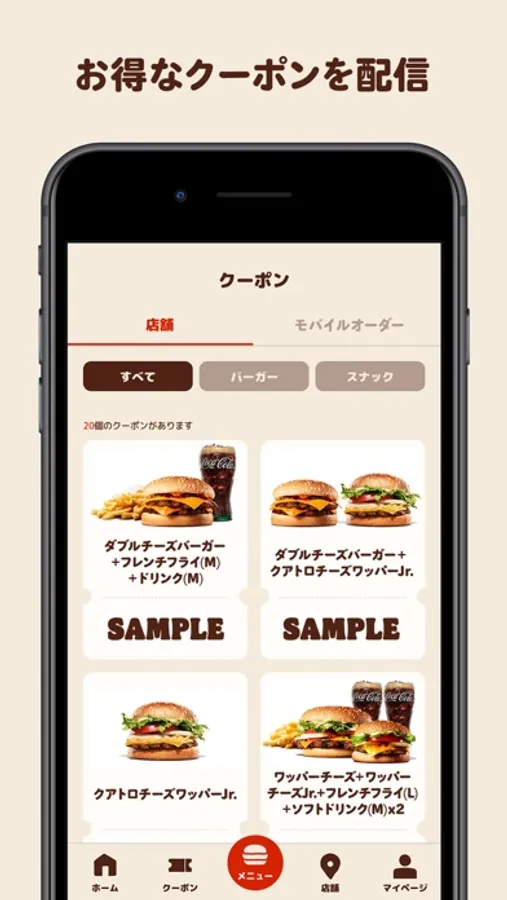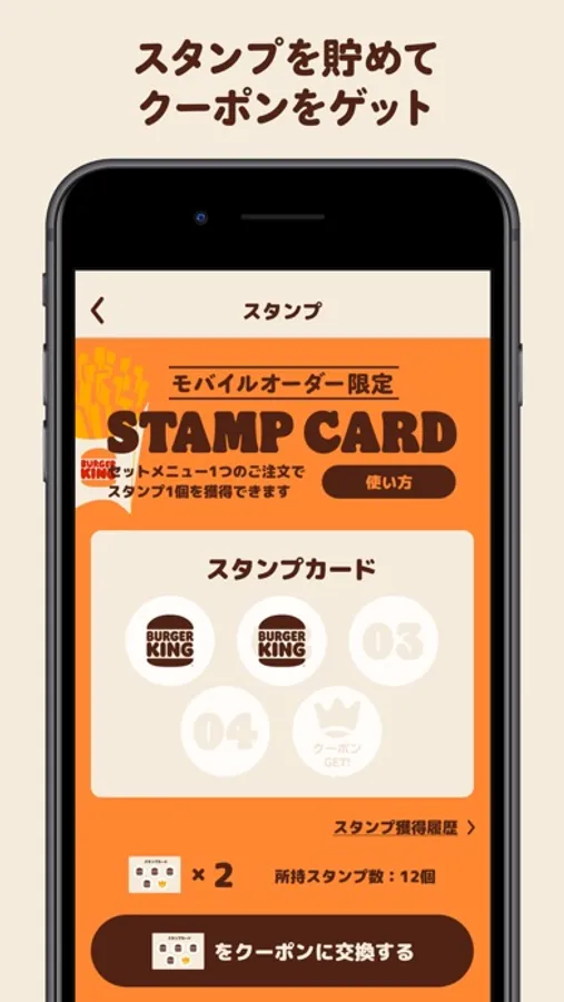 対象の商品をモバイルオーダーするとスタンプがもらえます。一定のスタンプ数を貯めるとクーポンと交換することができます。