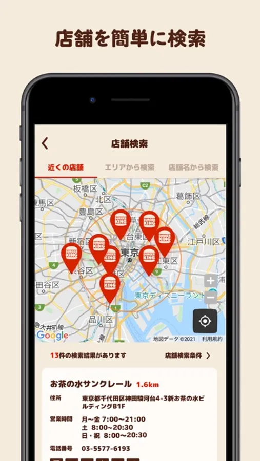 フリーWi-Fi、電源などの条件を設定し、近くのバーガーキング店舗を見つけることができます。