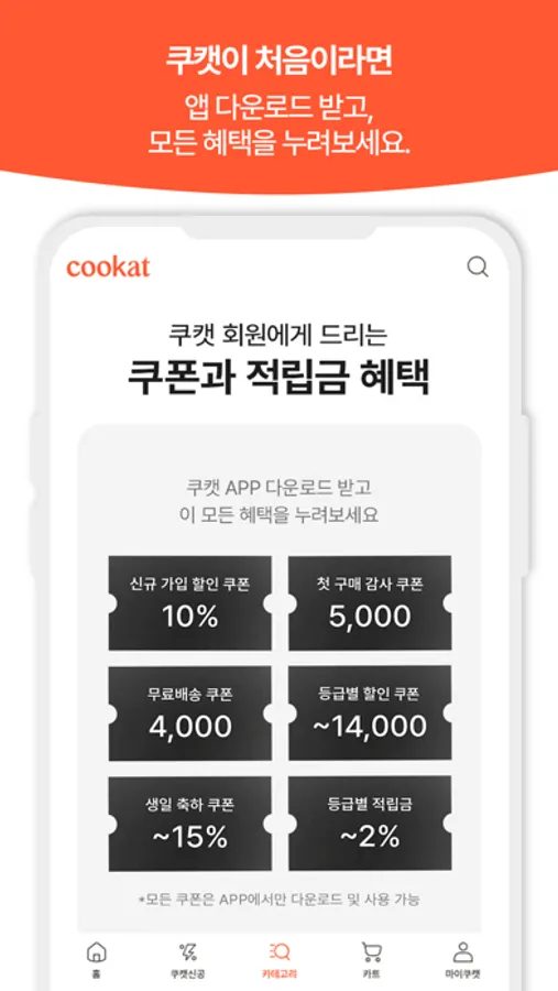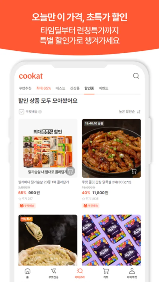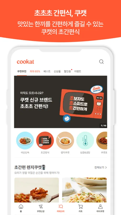 오직 쿠캣에서만 만날 수 있는 다양한 초간편식을 발견하고, 할인 혜택들도 즐겨보세요.