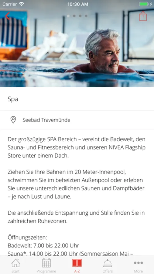 Stay up to date with special offers and opening hours for your perfect spa holiday. Courses and fitness classes are also displayed here.