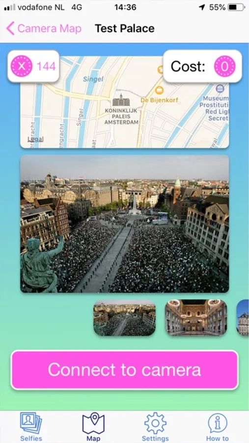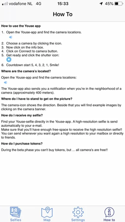Via the Youse-app you connect to a high resolution camera that takes your selfie. This camera is located in a unique place where you cannot reach yourself.