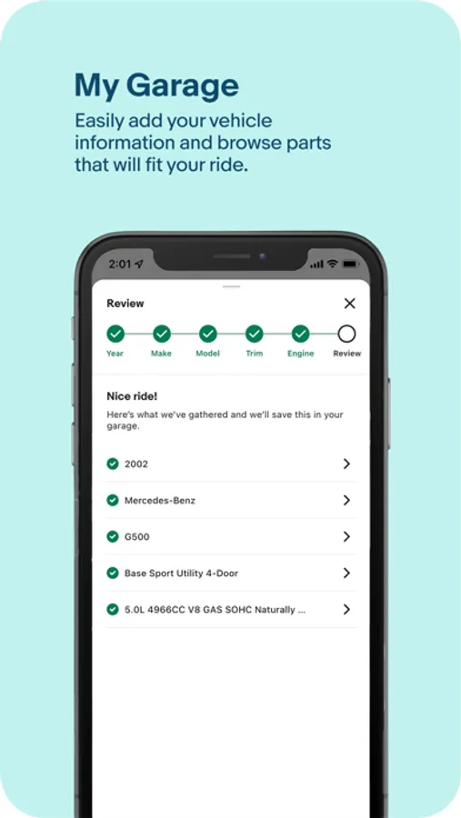 After you've added your vehicle to My Garage, check out eBay’s Fitment Finder. It gives you the confidence that the parts you buy on the eBay Motors app will fit your vehicle. Look for the green checkmarks to quickly pick out the right part for your ride.