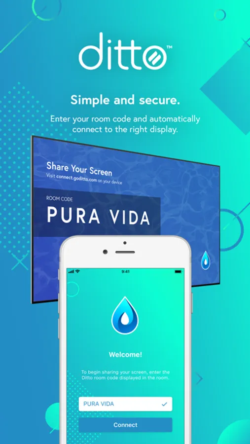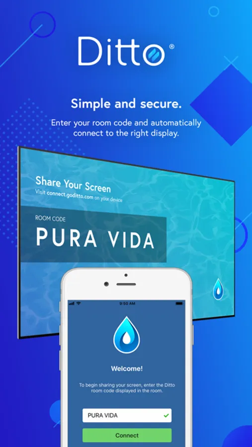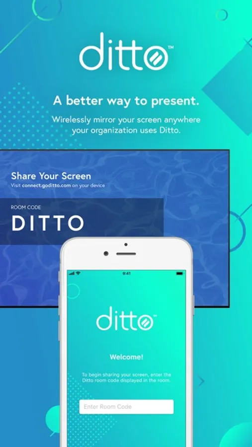 Simply enter a room code into Ditto Connect and your device will automatically connect to the appropriate Ditto receiver. Never worry about connecting to the wrong screen or not having the right adapters or technology again.