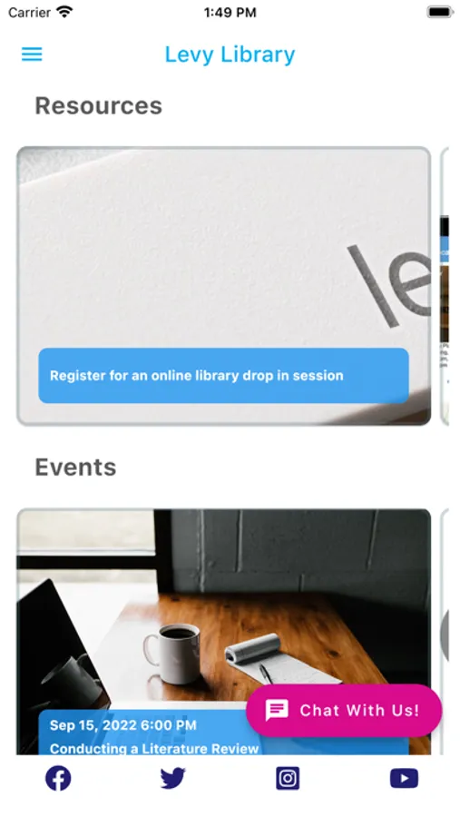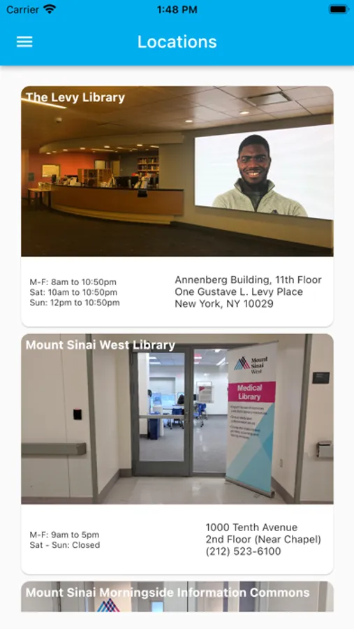 Discover popular library resources, journals and books, register for classes, and chat with a librarian--all within the Levy Library app! Other features include access to our blog, events calendar, library hours, contact information, and social media accounts, and an interactive map of library locations throughout the Mount Sinai Health System.