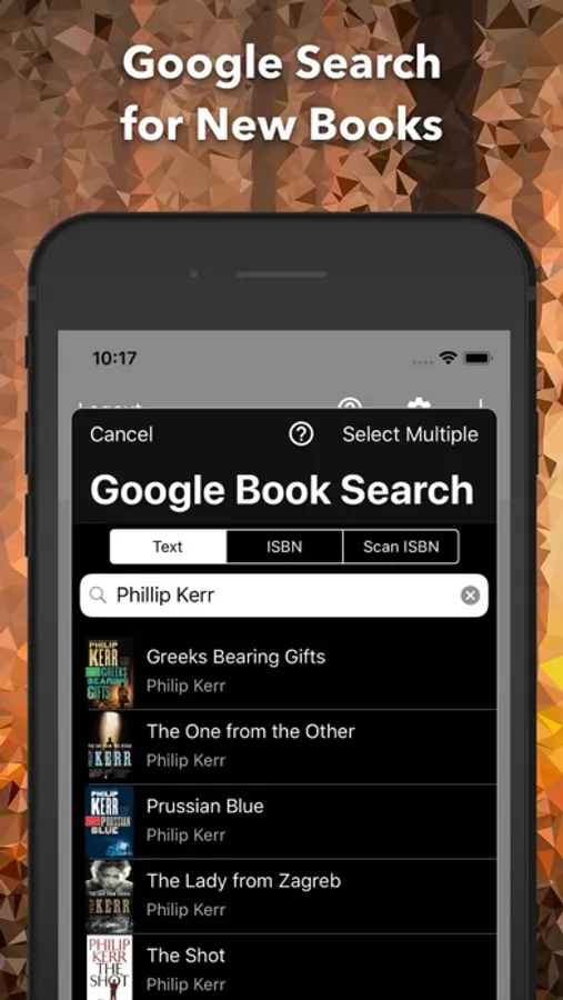 Finding and adding books to your bookshelf is easy. First try a Google Book Search within the app, and failing a successful hit, perform a manual entry or scan a physical book's barcode.
