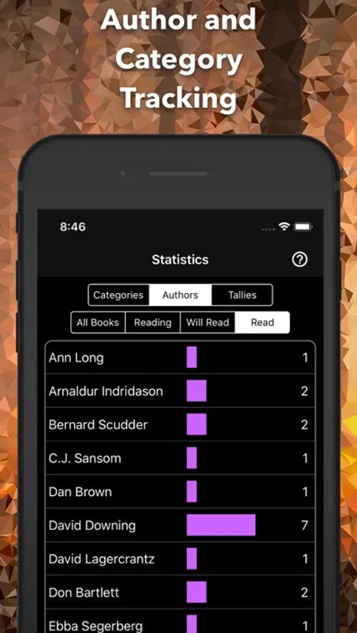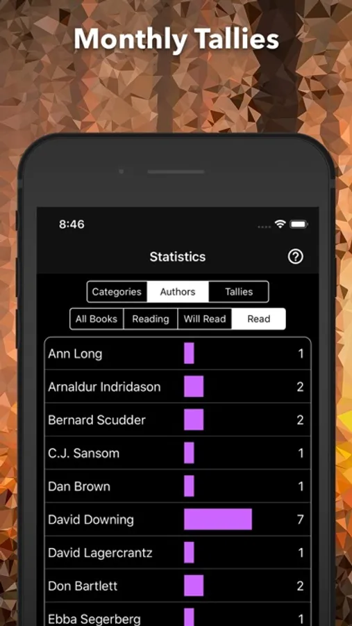 You can find books in on your bookshelves by either searching the list by author, category or title or, you can take a look at the bar charts and drill down on one of the monthly tallies, a, category, or an author.