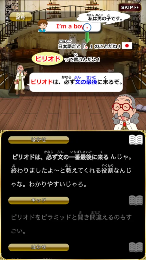 英語の基礎文法・フレーズを学ぶパートです。キャラクター同士の掛け合いの中で英語を学ぶことができ、語呂合わせを使った暗記法などを取り入れることで、学習の負担を軽減しています。また、扱われる例文や英単語はすべてネイティブ音声で聴くことができます。