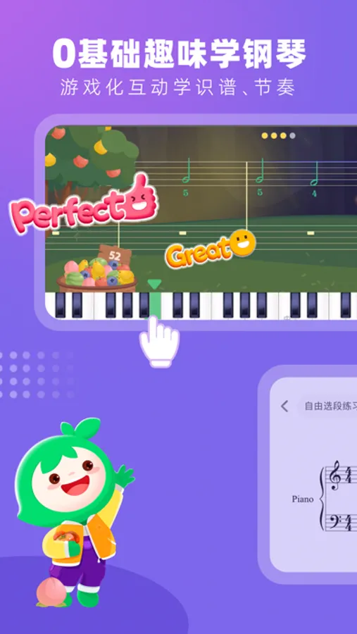 游戏化学习,利用人工智能技术进行趣味互动,赏析,节奏游戏训练、趣味问答、演奏练习等多个环节,让学琴有趣,不枯燥!