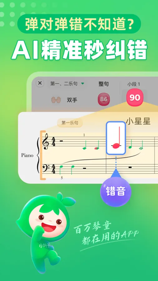 弹对音符变绿,弹错光标停止不前,停顿超5秒给予键盘提示,错音、漏音、错节奏及时纠正,辅助黄色小键盘标识,提升识谱能力,不懂钢琴,也能一眼识别练琴错误!