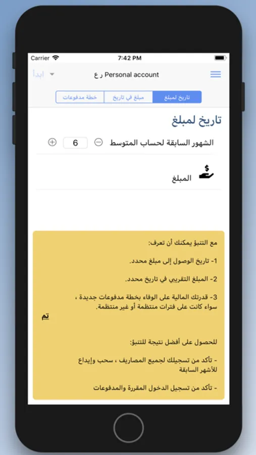الهدف الأساسي من التطبيق هو تمكينك من كل ماسبق بالإضافة إلى معرفة جميع ارصدتك بشكل فوري والتنبؤ بـ: