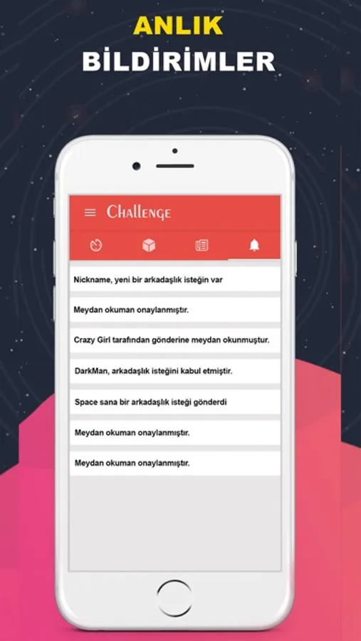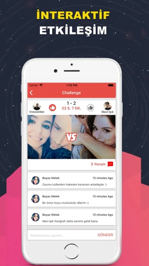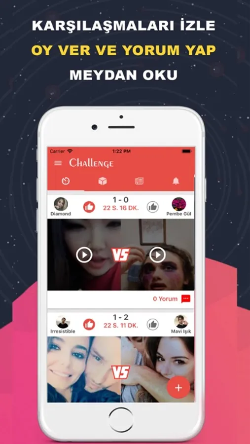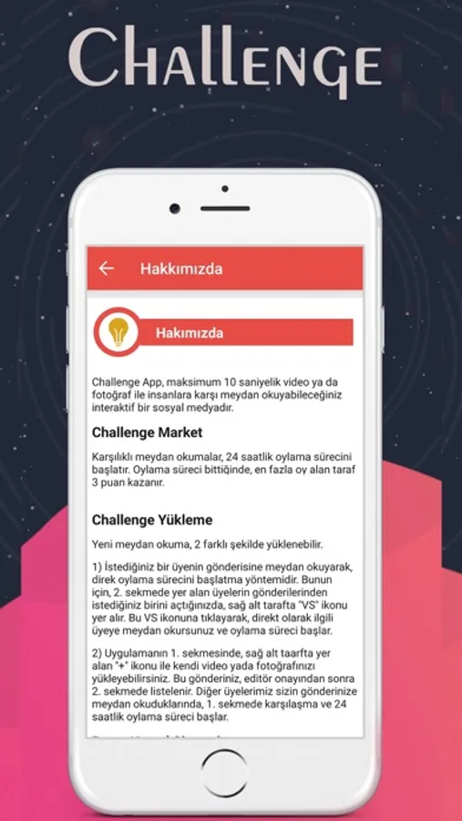 Challenge App, maksimum 10 saniyelik video ya da fotoğraf ile insanlara karşı meydan okuyabileceğiniz interaktif bir sosyal medyadır. Karşılıklı meydan okumalar, oylama sürecini başlatır. Oylama süreci bittiğinde, en fazla oy alan taraf 3 puan kazanır. Oylamanın berabere bitmesi durumunda her iki taraf 1 puan kazanır. En çok puana sahip ilk 100 üye, Liderler Tablosunda listelenir.