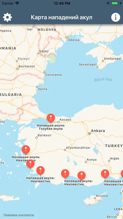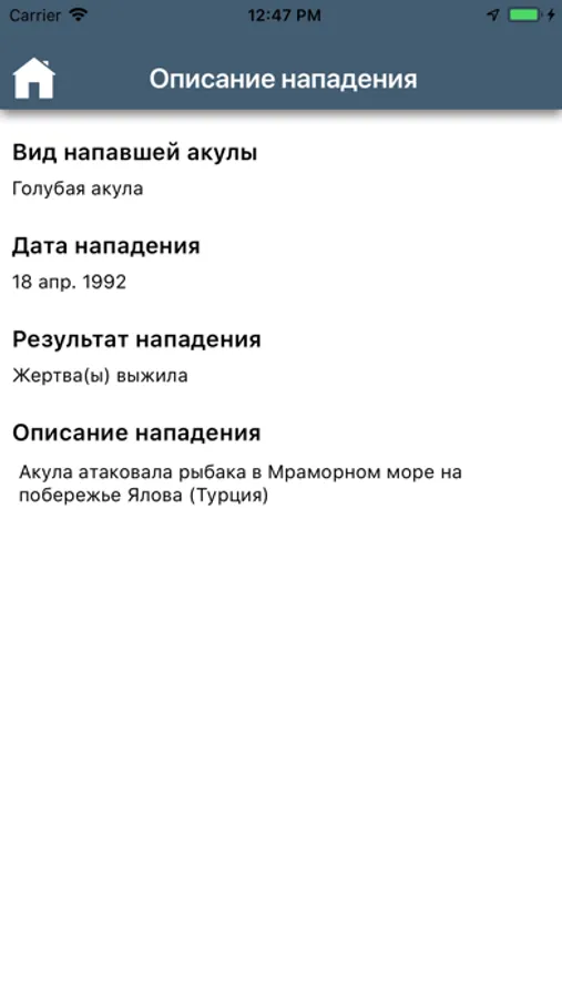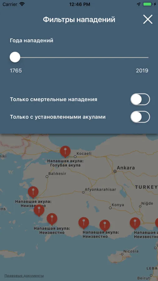 Приложение представляет собой базу данных всех нападений акул по всему миру за всю историю. На карте мира указаны все инциденты с атаками акул на отдыхающих.