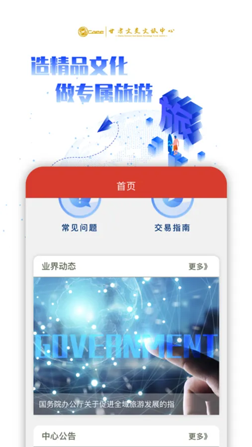 甘肃文交文旅中心手机客户端主要为交易商提供本中心文旅商品的挂牌、摘牌、提货、数据查询、公告查看、出入金等服务,通过手机客户端可随时掌握平台文旅商品的最新动态,为交易商提供文旅产品的一站式服务。
