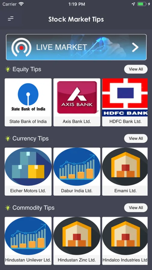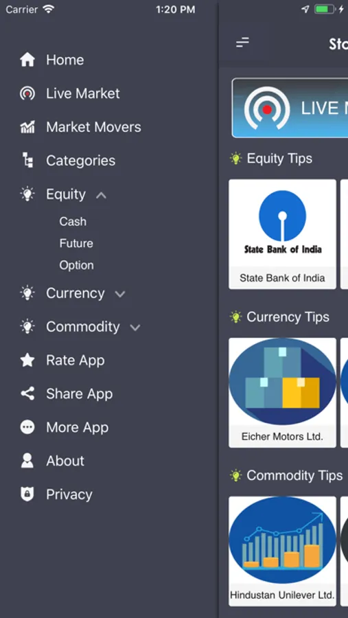 Stock Application provide the user to explore various section i.e., Commodity, Equity, Currency and Live stock. User can get all the latest information and tips regarding various stock which deals in Future, Option and Cash depending upon the stock. Now you can get all the detail at one place using this application
